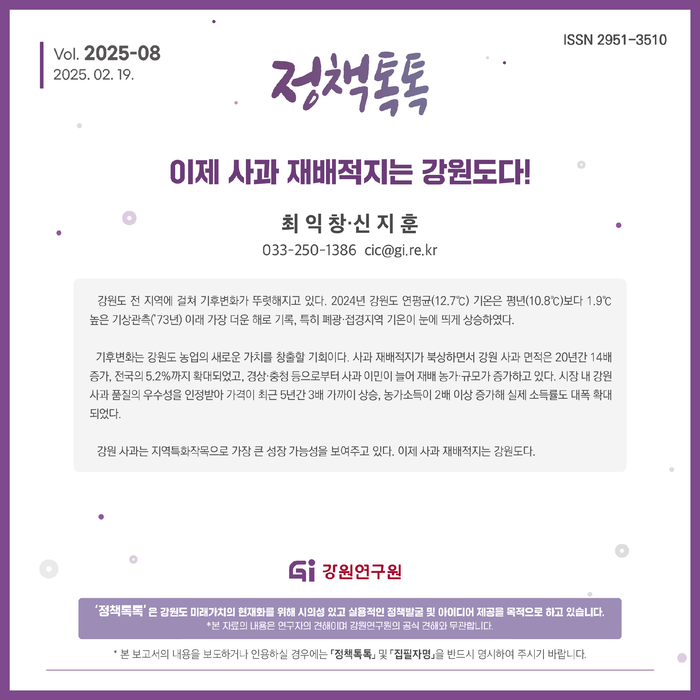 [스포츠서울ㅣ춘천=김기원기자]강원연구원(원장 현진권)은 「이제 사과 재배적지는 강원도다」라는 제목으로 2025년 제08호 정책톡톡을 발간했다.
