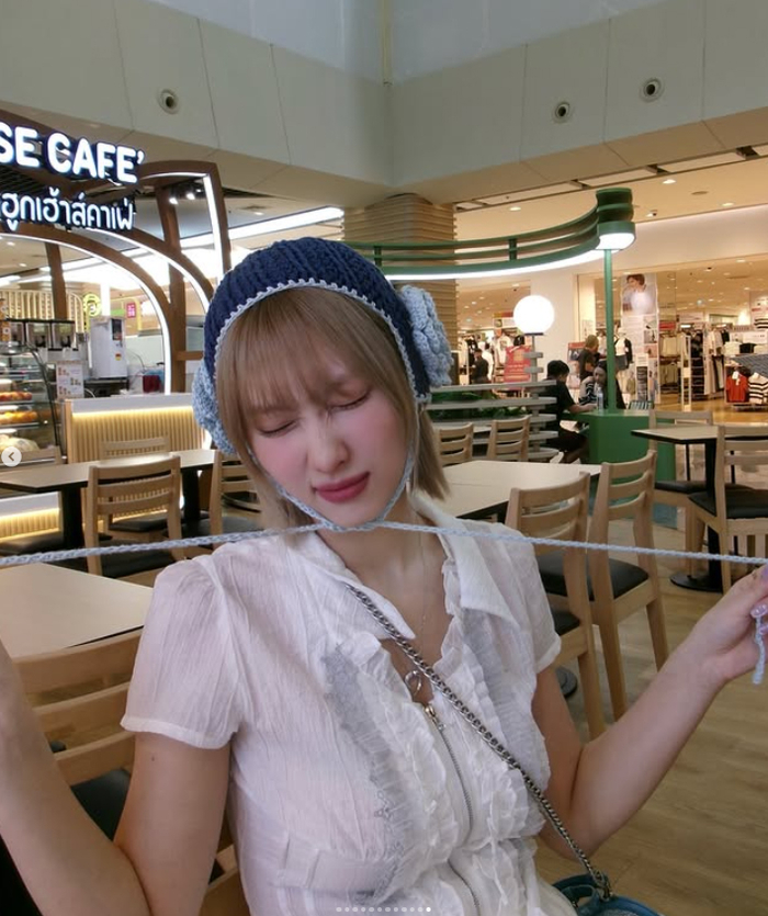 사진 속 모모는 흰색 드레스로 우아하고 러블리한 스타일을 연출하고 있다. 또한 파란색 니트 헤어밴드를 착용해 귀여운 분위기를 더했다.
