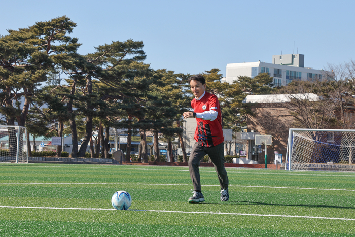 이날 김진태 지사는 여자축구부 유니폼을 착용하고 시축을 하며 선수들에게 응원의 메시지를 전했다.