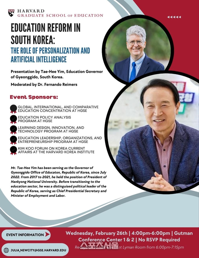 임태희 교육감의 하버드대 강연은 한국시각으로 27일 오전 6시부터 하버드대학 생중계 링크(아래 QR코드)에서 실시간으로 진행될 예정이다.