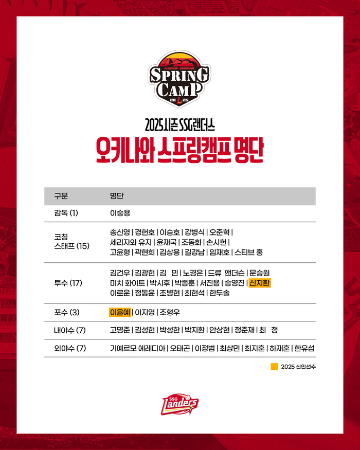 SSG 선수단은 23일 일본 오키나와행 비행기에 오른다. 오는 3월5일까지 2차 스프링캠프를 치른다. 이숭용 감독을 비롯해 코치진 16명, 투수 17명, 포수 3명, 내야수 7명, 외야수 7명 등 총 50명이 참가한다.