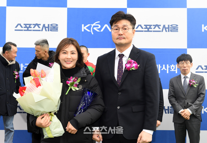 찬페이머스가 23일 한국마사회 렛츠런파크 서울에서 열린 ‘제38회 스포츠서울배 대상 경주’(8경주·국산 3세·1400M·총상금 2억원)에서 우승을 차지한 가운데 마주 슘호천(왼쪽)이 스포츠서울 염진근 편집인으로부터 트로피와 꽃다발을 받은 뒤 기념촬영을 하고 있다. 2024.02.23.