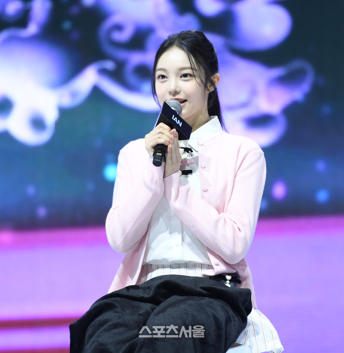 걸그룹 하츠투하츠(Hearts2Hearts) 이안이 24일 서울 광진구 예스24라이브홀에서 열린 첫 싱글 ‘더 체이스(The Chase)’ 발매 기념 미디어 쇼케이스에서 인사말을 하고 있다.