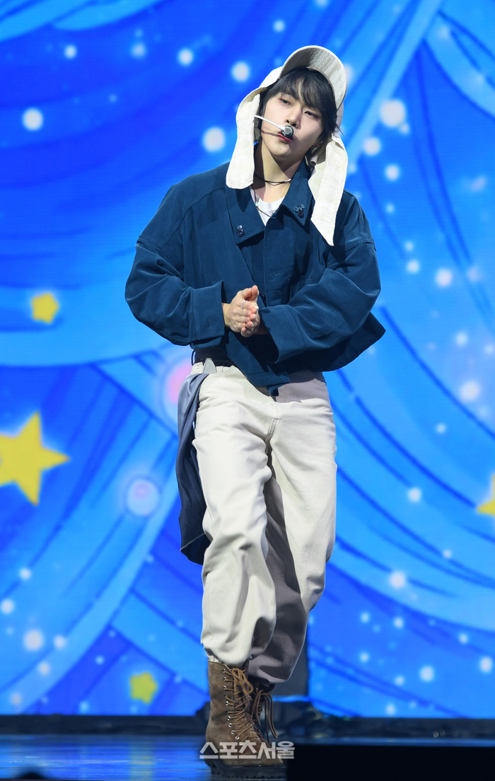 제로베이스원 석매튜가 24일 서울 용산구 블루스퀘어에서 열린 미니 5집 ‘블루 파라다이스(BLUE PARADISE)’ 발매 기념 미디어 쇼케이스에서 타이틀곡 ‘블루’를 부르고 있다.