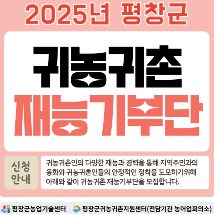 [스포츠서울ㅣ김기원기자]평창군은 귀농귀촌인의 다양한 인적자원을 활용하여 지역사회의 발전과 나눔 문화를 선도하기 위해 ‘재능 기부단’을 모집한다.