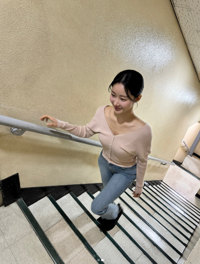 사진 속 한그루는 쇄골과 어깨라인이 드러나는 분홍빛 카디건에 청바지를 편하게 입고 계단을 오르고 있다.