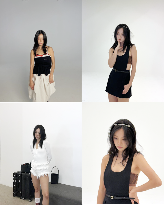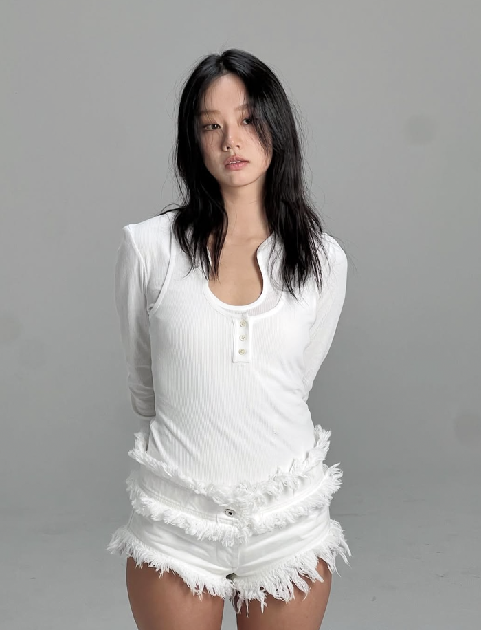 “냐옹”이라는 멘트처럼 깜찍한 고양이 머리띠를 한 혜리는 파격적인 옆트임 미니 원피스를 입고 포즈를 취하고 있다. 화이트의 상의와 핫팬츠를 입은 혜리의 모습도 인상적이다.