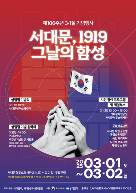 이성헌 구청장은 “제106주년 3.1절을 맞아 준비한 이번 기념행사를 통해 많은 분들이 자유와 평화의 가치를 공유할 수 있길 바라며, 국경일뿐만 아니라 언제든 역사의 현장인 서대문독립공원 일대를 즐겨 찾아주시길 기대한다”라고 말했다.