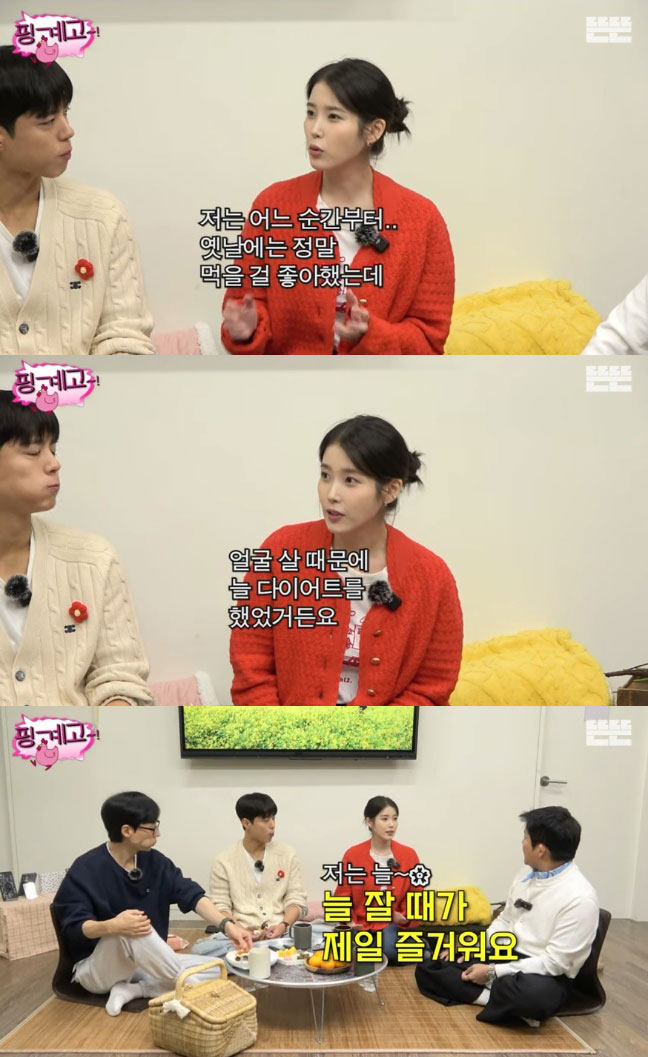이에 아이유는 “맞다. 특히 단 거를 진짜 좋아했다. 나는 얼굴부터 살이 찌는 편이라 데뷔하고 나서 얼굴 살 때문에 늘 다이어트를 했다. 근데 어느 순간부터는 그냥 전보다 먹고 싶지 않은 것 같다. 식욕 자체가 줄고, 위도 줄은 거 같다”고 밝혔다.