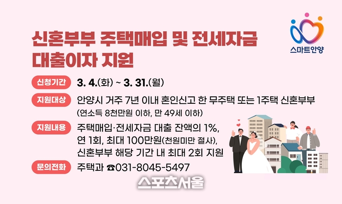 〔스포츠서울│안양=좌승훈기자〕경기 안양시는 ‘신혼부부 주택매입 및 전세자금 대출이자 지원’ 사업 참여자를 모집한다고 4일 밝혔다.