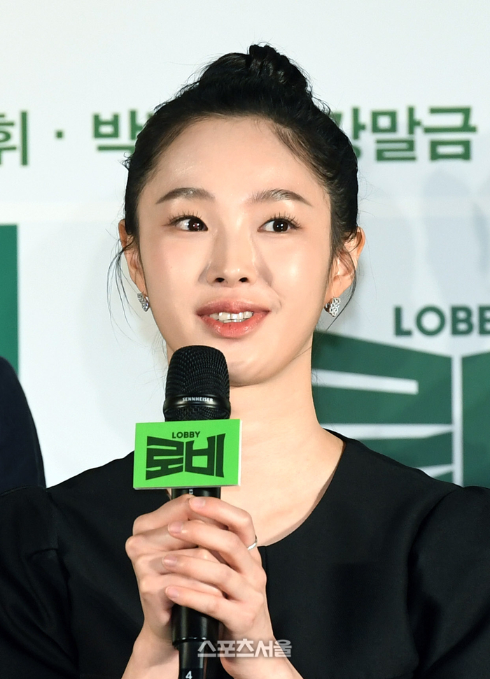 배우 강해림이 4일 서울 광진구 롯데시네마 건대입구점에서 진행된 영화 ‘로비’의 제작보고회에서 사회자의 질문에 답을 하고 있다.