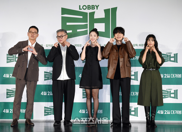 배우 하정우(왼쪽부터), 김의성, 강해림, 이동휘, 곽선영이 4일 서울 광진구 롯데시네마 건대입구점에서 진행된 영화 ‘로비’의 제작보고회에서 취재진을 향해 포즈를 취하고 있다.