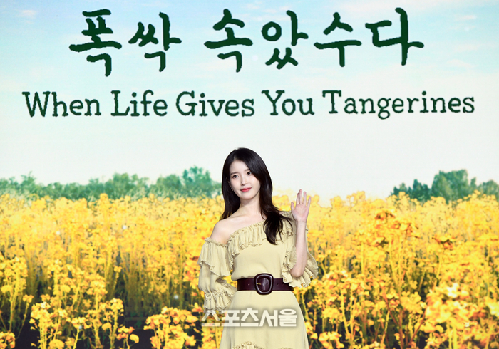 배우 아이유가 5일 서울 영등포구 콘래드호텔에서 진행된 넷플릭스 시리즈 ‘폭싹 속았수다’ 제작발표회에서 취재진을 향해 포즈를 취하고 있다.
