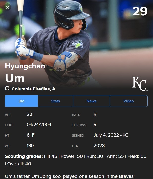 캔자스시티 로열스의 유망주로 평가받는 포수 엄형찬은 팀 내 29위에 랭크됐다. 포수 중에선 4위에 해당한다.