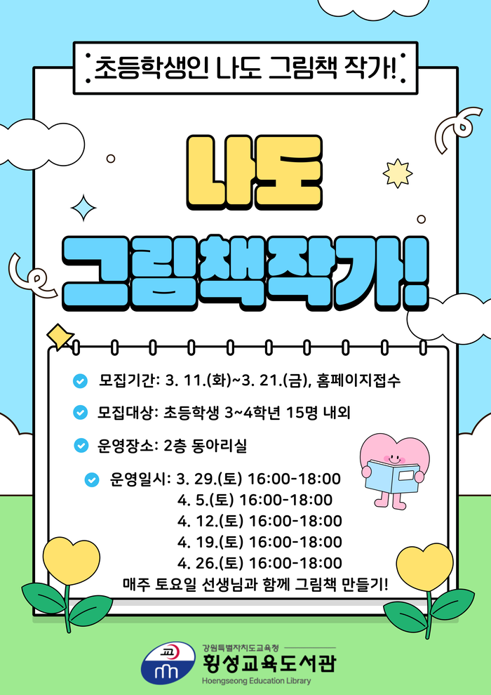 [스포츠서울ㅣ김기원기자]강원특별자치도교육청횡성교육도서관(관장 최복진)은 3월 29일부터 4월 26일까지 매주 토요일 16시부터 18시까지 횡성교육도서관 2층 동아리실에서 이야기를 직접 구상하며 그려보는 ‘나도 그림책 작가! 강좌를 운영한다.