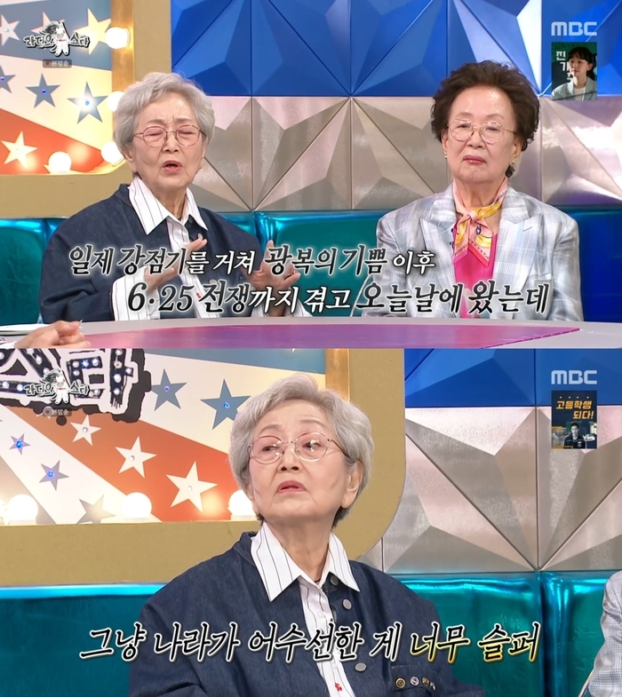 김영옥 역시 한 마디를 보탰다. 김영옥은 “나는 나문희와 친하다고 좌파라고 하더라. 우리는 좌파·우파 이런 거 모른다. 그냥 나라가 어수선한 게 너무 슬프다. 일제 강점기, 해방의 기쁨, 6·25 전쟁까지 겪고 오늘날에 왔는데 너무 슬프다”고 말했다.