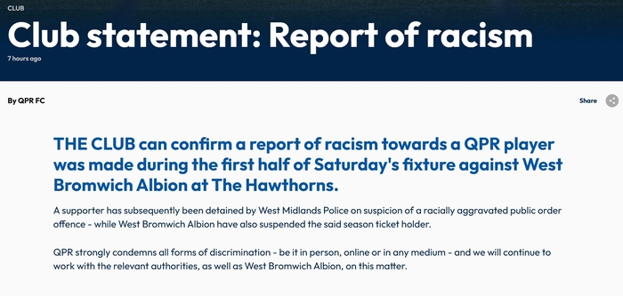 QPR은 9일(한국시간) 웨스트브롬위치와 2024~2025시즌 정규리그 36라운드 원정 경기 직후 구단 홈페이지를 통해 ‘우리 선수에 대한 인종차별 신고가 접수됐음을 확인했다’며 ‘서포터 1명이 인종차별 혐의로 경찰에 구금돼 있으며 웨스트브롬위치 구단도 그의 시즌권 효력을 정지시켰다’고 밝혔다.