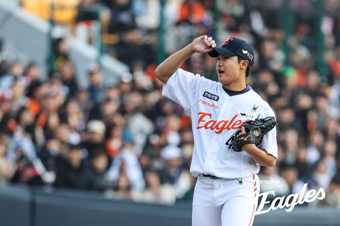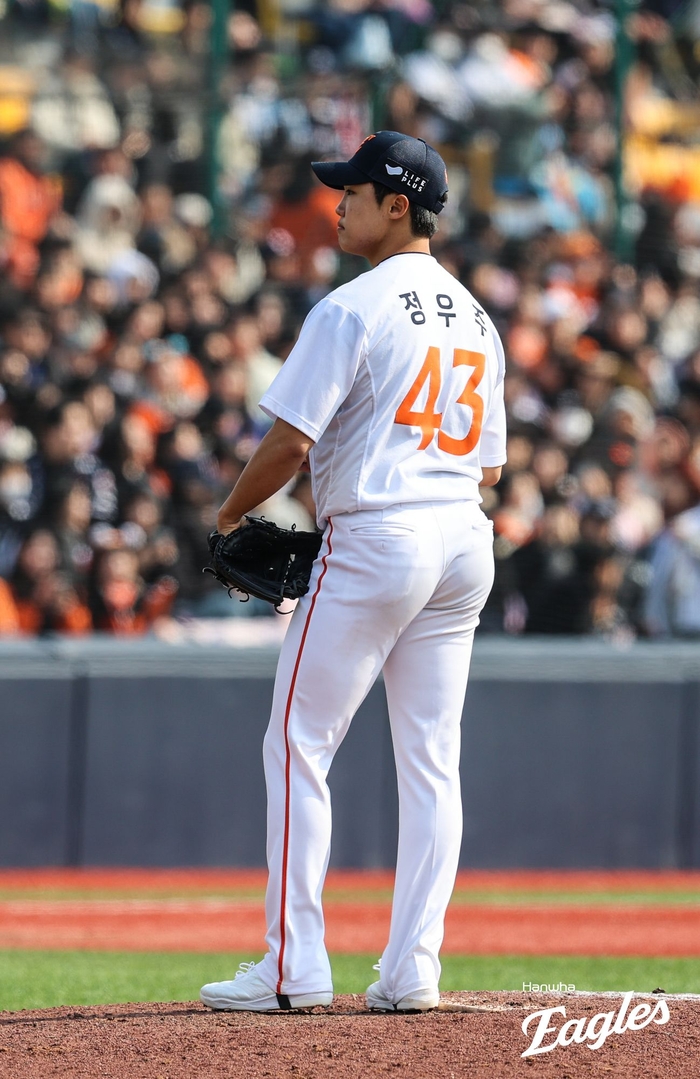 정우주는 지난 8일 청주구장에서 열린 시범경기 두산전에 불펜으로 등판해 1이닝 무실점 2탈삼진을 기록했다. 만원 관중 앞에서도 흔들림 없는 투구를 펼쳤다.