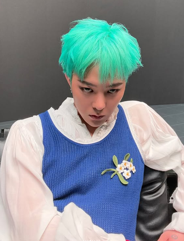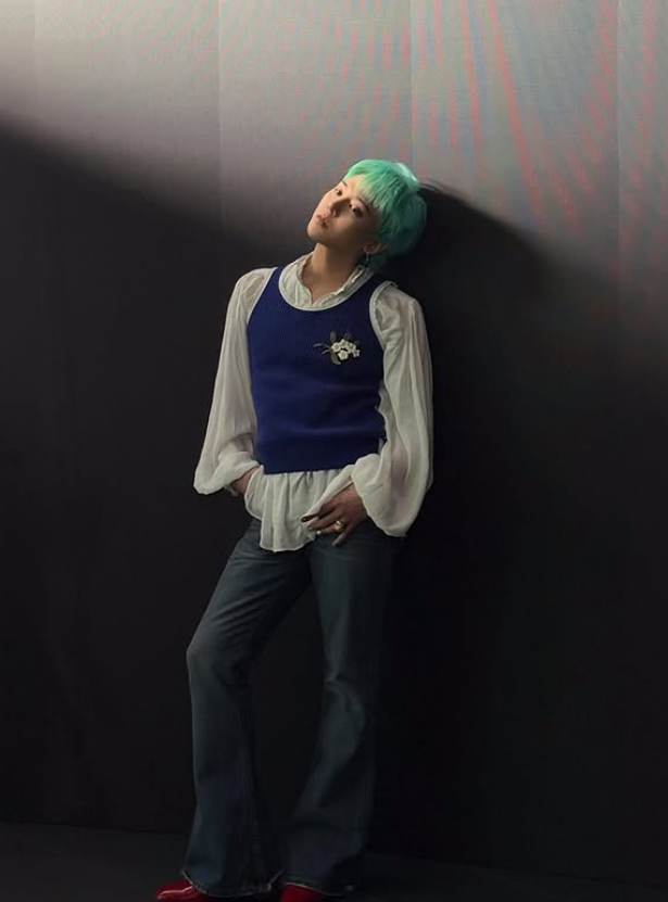 그는 화이트 셔츠와 블루 니트 베스트를 매치해 세련된 레트로 무드를 연출했다. 니트 베스트에는 꽃 자수가 더해져 디테일을 살렸으며, 여유로운 핏의 데님 팬츠와 강렬한 레드 슈즈로 스타일링을 완성했다.