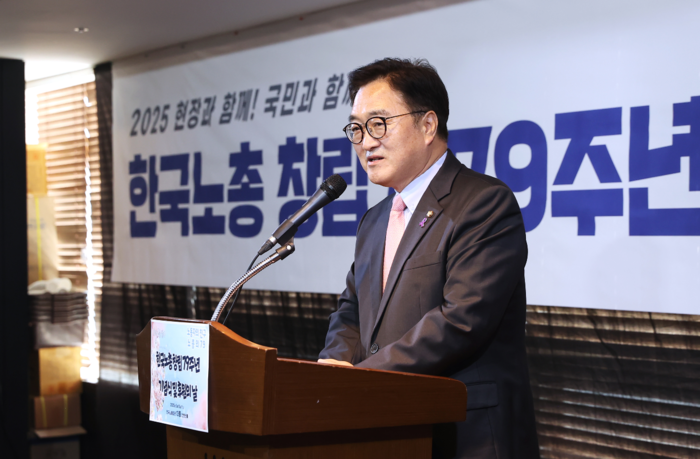우 의장은 이어 “작년 6월 한국노총을 비롯한 양대 노총과 대한상의·경총·중기중앙회 등 5개 노사단체에 국회의 사회적 대화 참여를 요청했고, 비상계엄 상황에서도 실무협의체는 계속 진행됐다”라며, “노사 간 여러 의제에 대해 상대방 입장을 경청하며 합의점을 찾아가려는 한국노총의 실력과 노력을 보며 국회가 이를 배워야 한다고 생각했다”라며 치하했다.