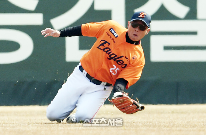 한화 좌익수 김태연이 11일 인천 SSG랜더스필드에서 열린 2025 KBO리그 SSG와 시범경기 1회말 SSG 최정의 타구를 몸을 던져 잡아내고 있다. 2025. 3. 11.