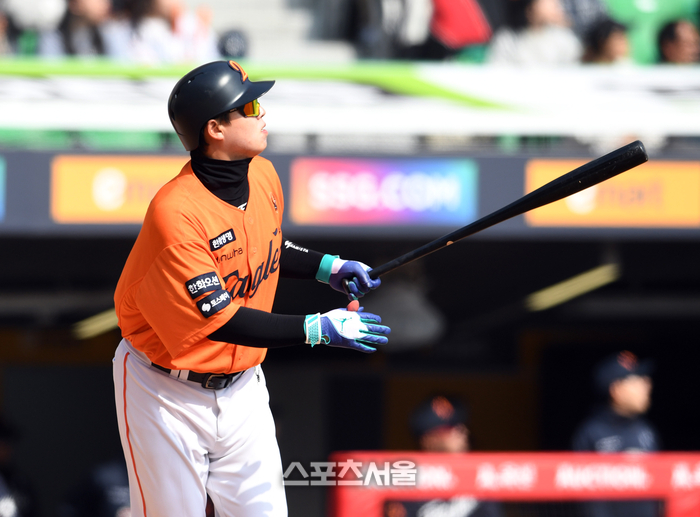 한화 노시환이 11일 인천 SSG랜더스필드에서 열린 2025 KBO리그 SSG와 시범경기 4회초 2사 1-2루 상황에서 SSG 신지환을 상대로 3점 홈런을 치고 있다. 노시환의 시범경기 첫 홈런. 2025. 3. 11.
