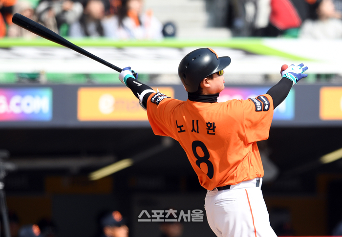 한화 노시환이 11일 인천 SSG랜더스필드에서 열린 2025 KBO리그 SSG와 시범경기 4회초 2사 1-2루 상황에서 SSG 신지환을 상대로 3점 홈런을 치고 있다. 노시환의 시범경기 첫 홈런. 2025. 3. 11.