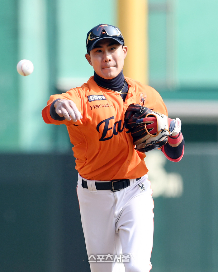 한화 유격수 심우준이 11일 인천 SSG랜더스필드에서 열린 2025 KBO리그 SSG와 시범경기 4회말 2사 2루 상황에서 SSG 박지환의 타구를 잡아 1루로 송구하고 있다. 2025. 3. 11.