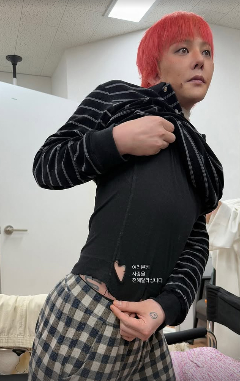 공개된 사진 속 지드래곤은 하트 모양으로 찢어진 옷을 잡고 포즈를 취하며 특유의 유쾌한 매력을 발산했다. 체크무늬 바지와 스트라이프 패턴의 상의를 매치한 그의 캐주얼한 스타일링이 눈길을 끌었다.