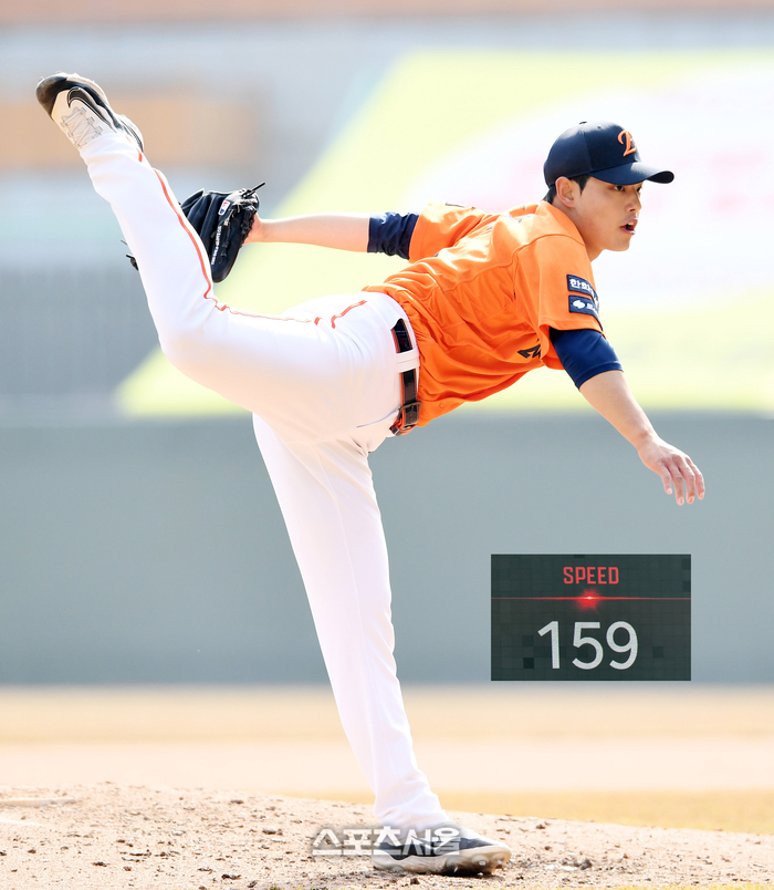 문동주는 11일 문학 SSG전에 등판해 1이닝 1안타 1볼넷 2삼진 무실점 호투를 뽐냈다. 최고 시속 159.7㎞까지 나왔다. 그야말로 강속구다. 시속 160.1㎞라는 KBO리그 역대 최고 구속을 보유한 투수다. 육박하는 공을 뿌렸다. 그것도 시범경기에서 나왔다.