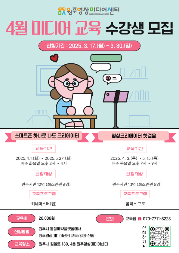 자세한 사항은 원주영상미디어센터(☎070-7711-8223)로 문의하면 된다.