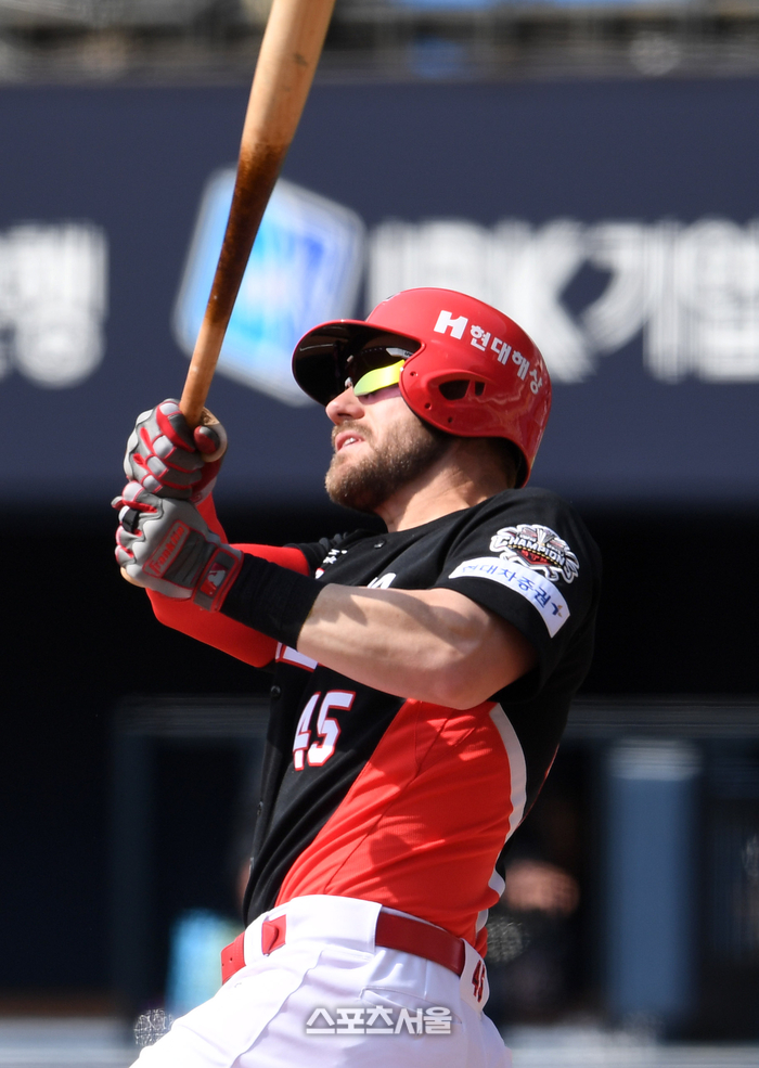 KIA 위즈덤이 14일 잠실구장에서 열린 2025 KBO리그 두산과 시범경기 1회초 1사 3루 상황에서 두산 선발 최승용을 상대로 2점 홈런을 치고 있다. 위즈덤의 시범경기 첫 홈런. 2025. 3. 14.