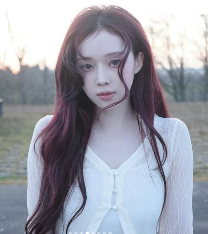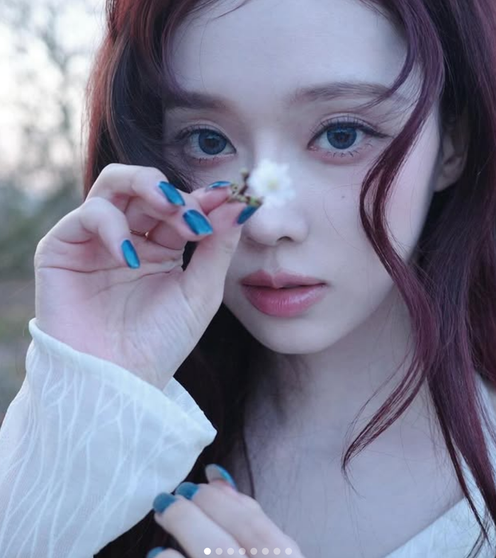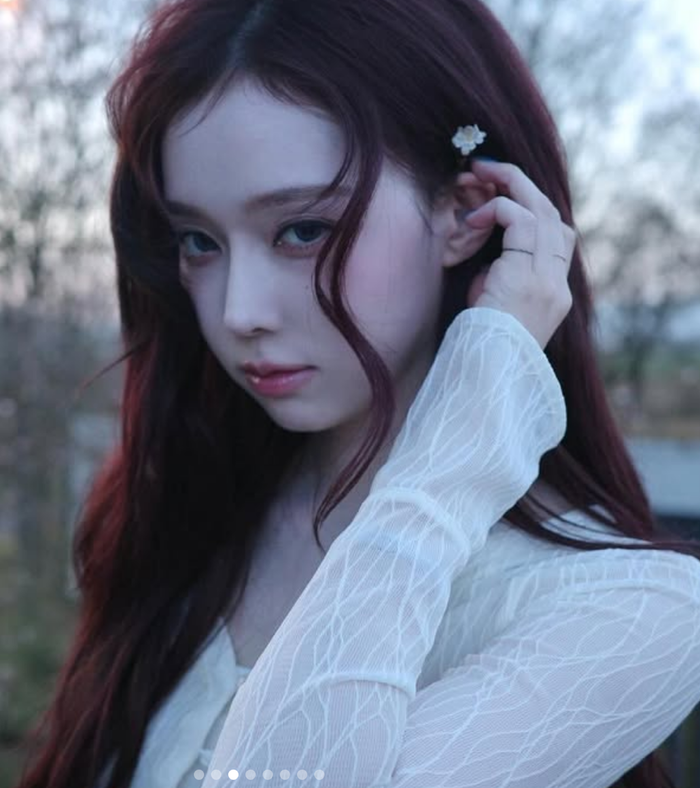 레드와인 컬러의 헤어스타일과 윈터의 순백 피부가 만나 완벽한 조화를 이뤘다.