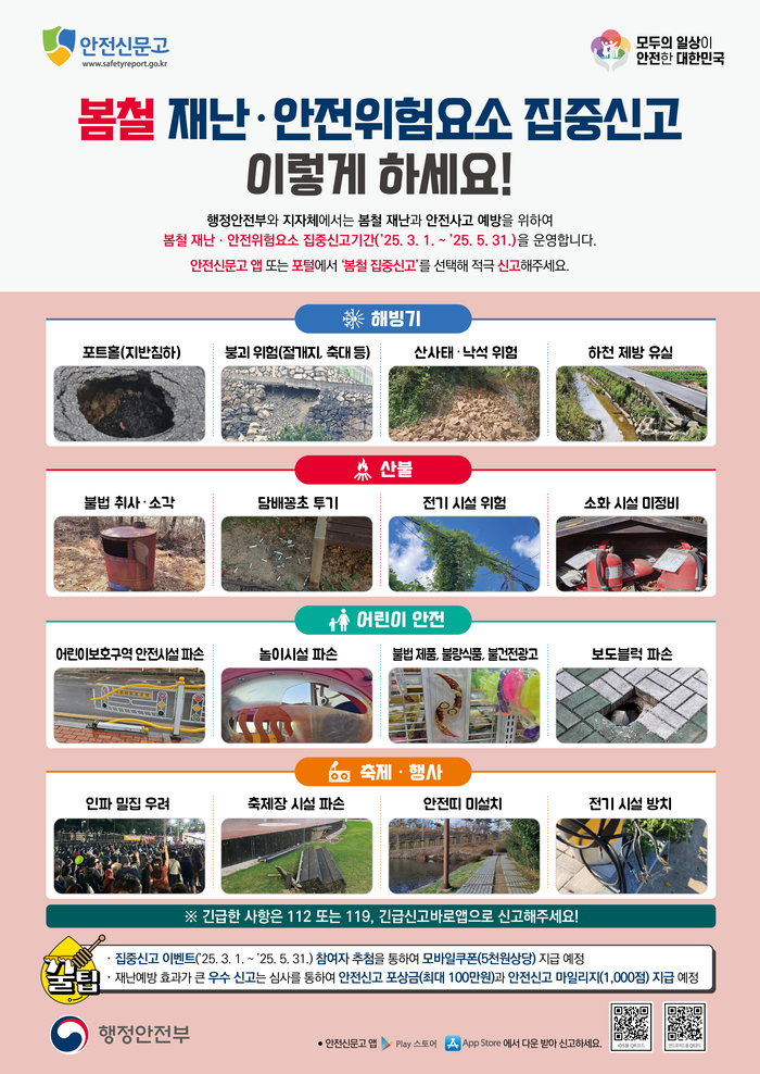 이번 집중신고제는 재난 발생 또는 징후를 발견하면 누구나 즉시 안전신문고 앱 또는 홈페이지를 통해 신고할 수 있다. 접수된 신고는 담당자에게 배정되어 현장을 점검하고 적절한 조치가 치러지며, 위험도가 높다고 판단되는 경우 지속적으로 관리하여 추가 사고를 예방할 계획이다.
