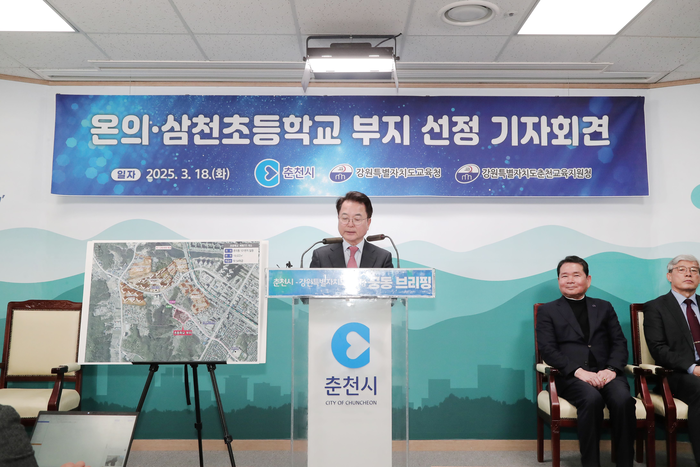 [스포츠서울ㅣ춘천=김기원기자]춘천시(시장: 육동한)와 강원특별자치도교육청(교육감: 신경호)은 3월 18일 춘천시청에서 공동 기자회견을 열고 온의·삼천지구 초등학교 설립부지를 온의동 101번지 일대로 최종 선정했다고 발표했다.