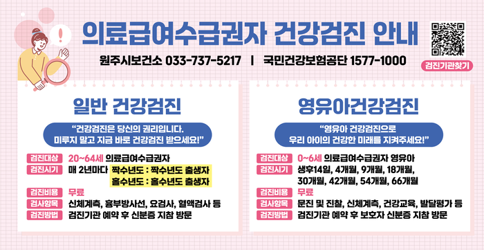 [스포츠서울ㅣ원주=김기원기자]원주시는 의료급여수급권자의 건강을 보호하고 질병을 예방하기 위해 건강검진 비용을 지원하고 있다.