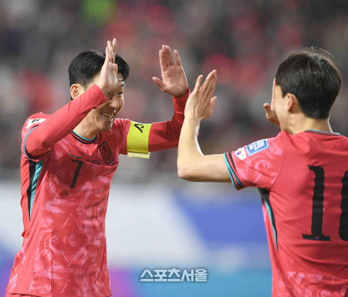 이재성이 25일 수원월드컵경기장에서 열린 2026 FIFA 북중미 월드컵 3차 예선 요르단과 경기에서 골을 넣은 후 손흥민과 환호하고 있다.