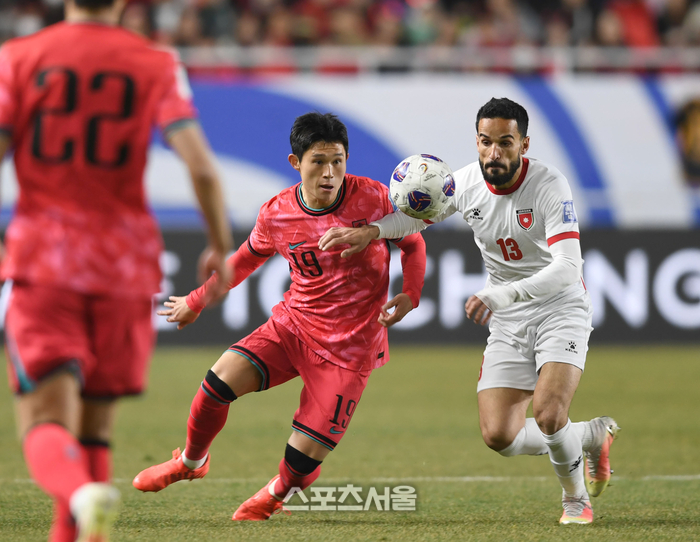 이동경이 25일 수원월드컵경기장에서 열린 2026 FIFA 북중미 월드컵 3차 예선 요르단과 경기에서 상대와 볼다툼을 하고 있다.