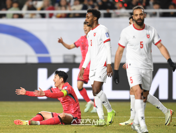 손흥민이 25일 수원월드컵경기장에서 열린 2026 FIFA 북중미 월드컵 3차 예선 요르단과 경기에서 심판이 파울을 불지 않자 항의하고 있다.