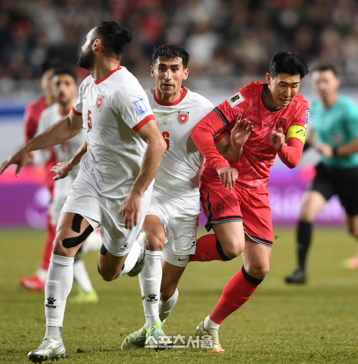 손흥민이 25일 수원월드컵경기장에서 열린 2026 FIFA 북중미 월드컵 3차 예선 요르단과 경기에서 상대와 몸싸움을 하다 넘어지고 있다.