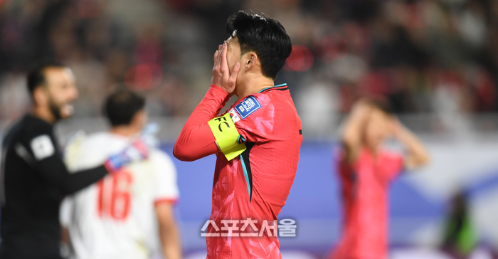 손흥민이 25일 수원월드컵경기장에서 열린 2026 FIFA 북중미 월드컵 3차 예선 요르단과 경기에서 후반전 골기회가 무산되자 아쉬워하고 있다.