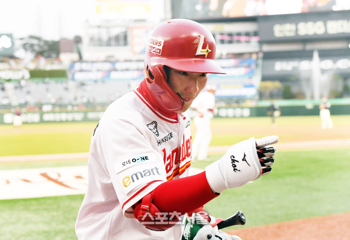 SSG 최지훈이 26일 인천 SSG랜더스필드에서 열린 2025 KBO리그 롯데와 경기 1회말 무사 롯데 선발 김진욱을 상대로 선제 솔로 홈런을 치고 더그아웃을 향해 세리머니를 하고 있다. 2025. 3. 26.