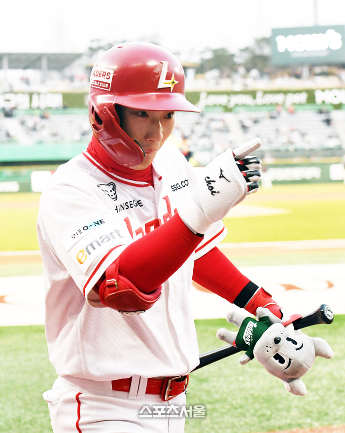 SSG 최지훈이 26일 인천 SSG랜더스필드에서 열린 2025 KBO리그 롯데와 경기 1회말 무사 롯데 선발 김진욱을 상대로 선제 솔로 홈런을 치고 더그아웃을 향해 세리머니를 하고 있다. 2025. 3. 26.