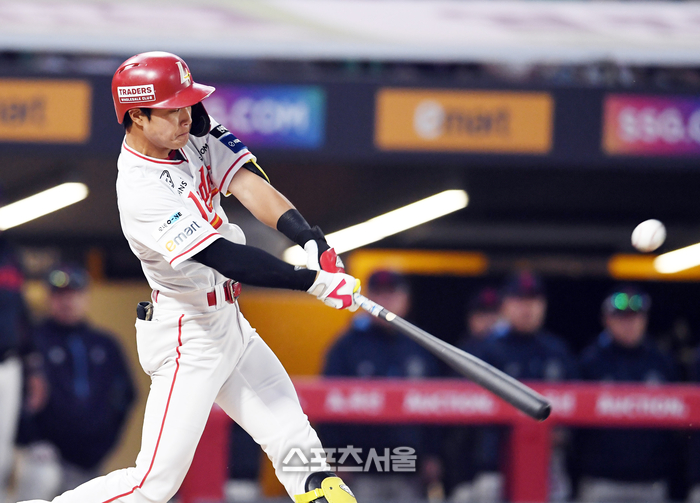 SSG 박지환이 26일 인천 SSG랜더스필드에서 열린 2025 KBO리그 롯데와 경기 2회말 2사 1-2루 상황에서 롯데 선발 김진욱을 상대로 1타점 적시타를 치고 있다. 2025. 3. 26.