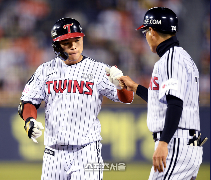 LG 문성주가 26일 잠실야구장에서 열린 2025 KBO 리그 한화와 경기 6회말 2사1,2루 2타점 중전안타를 친 후 송지만 코치와 하이파이브를 하고 있다.