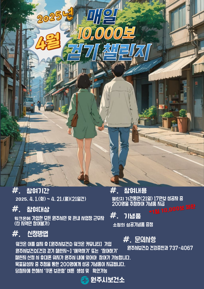 이번 챌린지는 4월 1일(화)부터 21일(월)까지 운영하며, 원주시민이라면 누구나 참여할 수 있다.