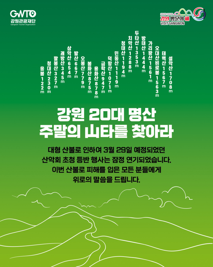 [스포츠서울ㅣ춘천=김기원기자]강원관광재단(대표이사 최성현, 이하 재단)은 전국 곳곳에서 발생한 대형 산불의 심각성을 고려하여, 3월 29일(토) 춘천 삼악산에서 진행 예정이었던 강원 20대 명산 등반 캠페인 행사를 잠정 연기하기로 했다.