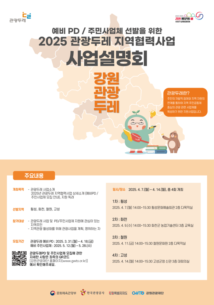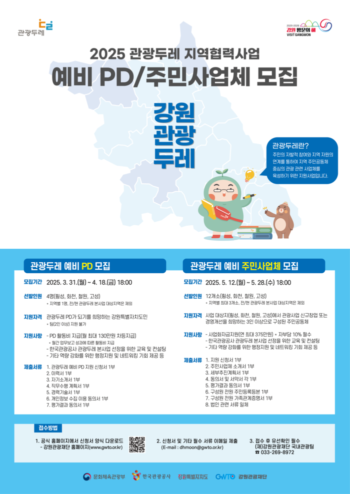 [스포츠서울ㅣ춘천=김기원기자]강원특별자치도(도지사 김진태)와 강원관광재단(대표 최성현, 이하 재단)은 ‘2025 관광두레 지역협력사업’의 신규 예비 PD를 모집한다고 31일 발표했다. 이 사업은 관광 인재와 관광 사업체를 발굴하고 지원하는 사업으로 강원 지역 관광 활성화와 지속 가능한 관광 생태계 구축을 목표로 한다. 모집 지역은 강원특별자치도 내 4개 시군(횡성, 화천, 철원, 고성)으로, 해당 지역은 한국관광공사 관광두레 본사업 미선정 지역이다.