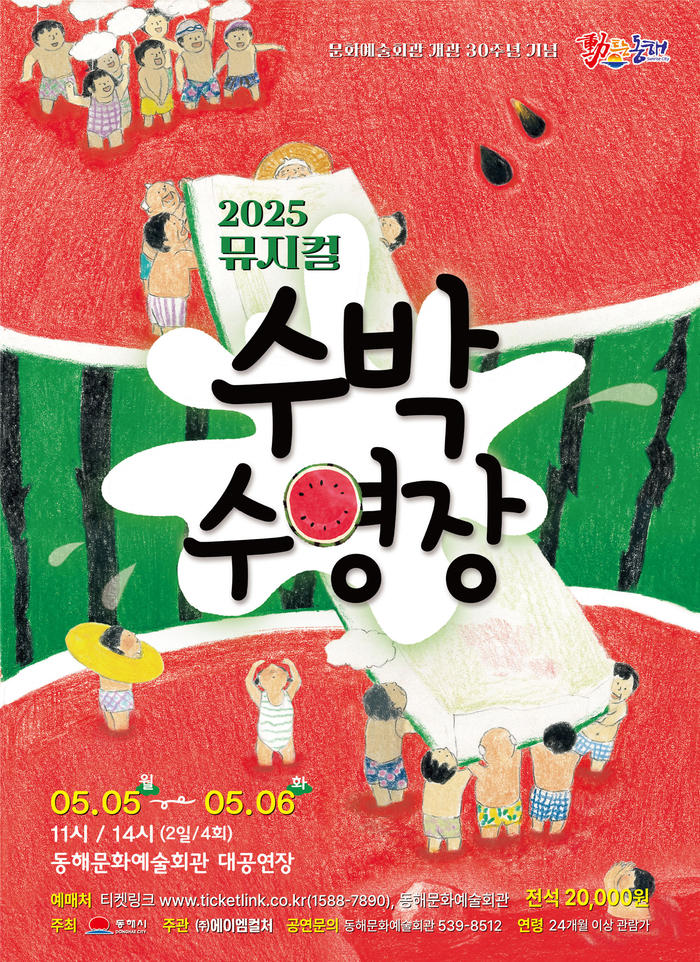 [스포츠서울ㅣ김기원기자]동해시는 문화예술회관 개관 30주년을 맞아 오는 5월 5일과 6일, 양일간 총 4회에 걸쳐 대공연장에서 기획 초청 뮤지컬 ‘수박수영장’을 선보인다. 공연은 오전 11시와 오후 2시, 하루 2회씩 진행된다.