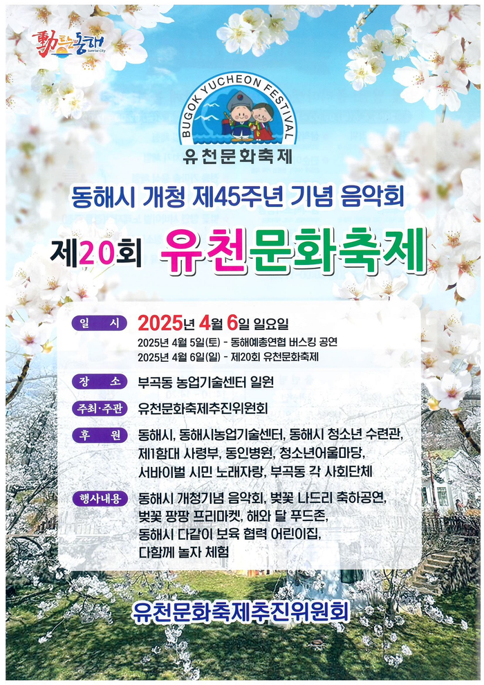 [스포츠서울ㅣ김기원기자]제20회 유천문화축제가 오는 4월 6일 동해시 부곡동 농업기술센터 일원에서 열린다. 봄을 맞아 벚꽃과 함께 지역주민이 즐길 수 있는 다양한 프로그램이 마련됐다.
